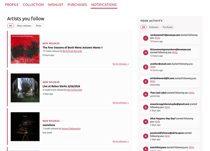 If you head over to "profile" and the "notifications" tab, you'll notice that this section has had a significant overhaul to improve legibility and functionality, with feeds where you can toggle music releases and blog posts from those you follow and look at your personal activity from followers on the right hand side.
