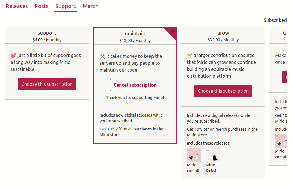 We've made some significant improvements to this area with artists and labels now able to add releases to specific tiers as well as discounts on merch and digital items. The page has also generally received some TLC so that it's clear how you're supporting, how much, and what you're getting for it. Not supporting our development yet? Pitch in!