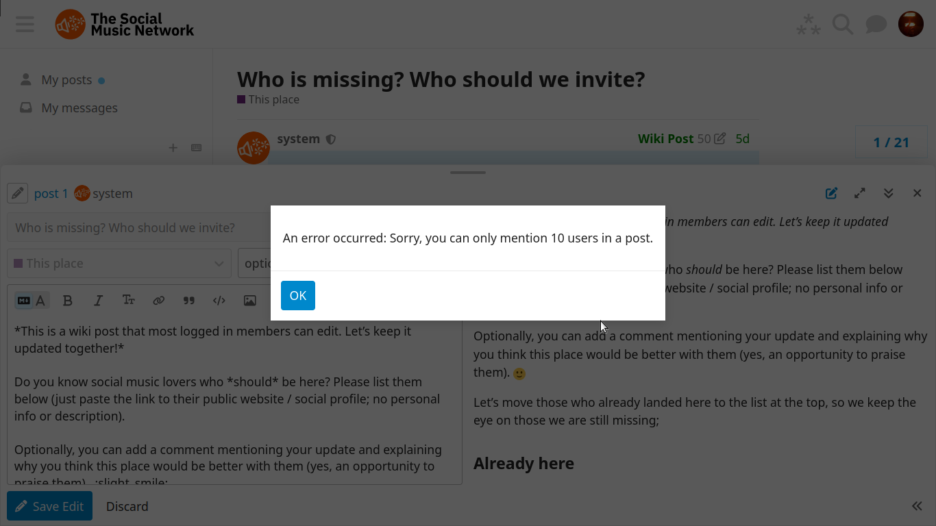 I found a setting! You should now be able to mention 20 users. The settings is for all users (except new users), so I don’t want to set it too high. But I can increase it later if necessary.